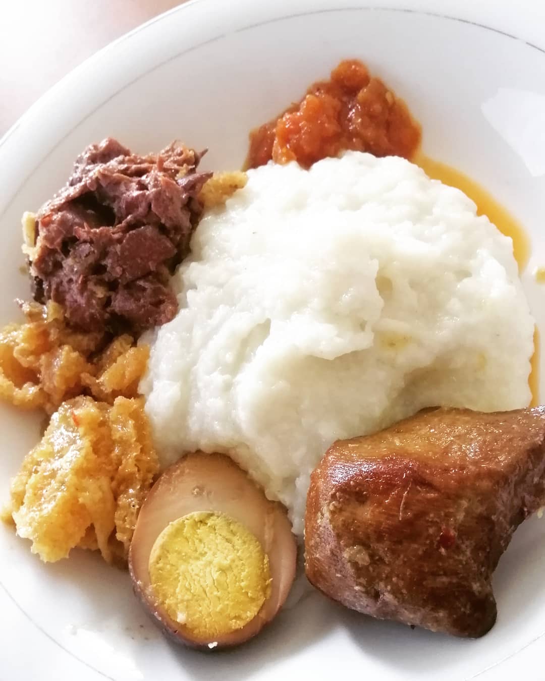 Serving: Gudeg is typically served with steamed white rice (nasi gudeg) and a variety of condiments. Common condiments include sambal (chili paste), fried tofu, fried tempeh, hard-boiled eggs, and krecek (spicy beef skin). The combination of sweet, savory, and spicy flavors creates a harmonious taste experience.